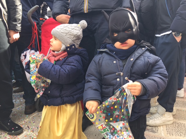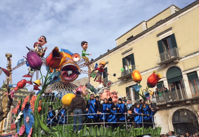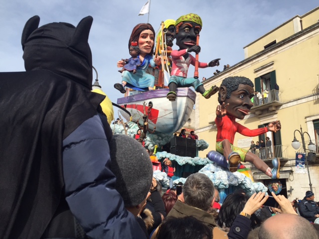 La genesi del Carnevale di Putignano, ha una storia secolare che inizia nel 1934. È il carnevale più lungo e più antico d’Europa; è una festa ricca di tradizioni, riti ed eventi. Uno degli appuntamenti imperdibili del Carnevale di Putignano, è il corso mascherato con animazione e coreografie dei carri allegorici in cartapesta, rappresentanti il mondo della società, della politica, della cultura. I carri allegorici sfilano lungo il corso, lasciando grandi e piccini a bocca aperta, per l’originalità, la raffinatezza, e per le precise rifiniture della cartapesta. Nulla è lasciato al caso, ogni particolare è curato da maestri che si tramandano da generazioni, i segreti di questo affascinante mestiere; questi maestri con grande arte, plasmano e danno vita a sculture immense, animate da computer che guidano l’alternarsi dei movimenti. Un’esplosione di colori, di musica ed allegria vi travolgerà, lasciandovi anche però riflettere su temi scottanti di attualità. I sette carri che hanno sfilato durante questo carnevale 2016 avevano come tema, la diversità che purtroppo ancor oggi spaventa, legata per esempio al colore della pelle, alla provenienza, alla religione professata; quella diversità, viene superata solo davanti a momenti di grandi emergenza e davanti all’estremo appuntamento. La diversità spaventa chi è non ha capito che l’unica diversità importante, è quella insita nell’animo umano; questo é uno dei messaggi che si è voluto trasmettere durante questo Carnevale di Putignano 2016. Queste opere invitano a riflettere, a guardare oltre, ad alzare la testa. Si vuole far passare un messaggio importante attraverso questi carri allegorici, nonostante il contesto di festa, si vuole trasmettere… un momento di riflessione. I carri sono accompagnati da sfilate di bambini ed adulti mascherati, tanti personaggi della Disney e di fantasia per i più piccini, tanta musica, tanta ilarità, tanto divertimento; insomma è un evento da non perdere! È stato bello tornarci con Franci oggi, erano circa trent’anni che mancavo a questo evento; è stato bellissimo condividere questa giornata di festa anche assieme ai nostri amici ed all’adorabile Michi, l’amichetta del cuore del mio piccolo dolce hooligan. Michi e Franci erano travestiti da Biancaneve e Batman, ed hanno assistito con immensa gioia e stupore all’intera sfilata, che è durata circa 1 ora e trenta minuti. E’ stata una bellissima giornata per tutti, e sicuramente ci torneremo anche l’anno prossimo.